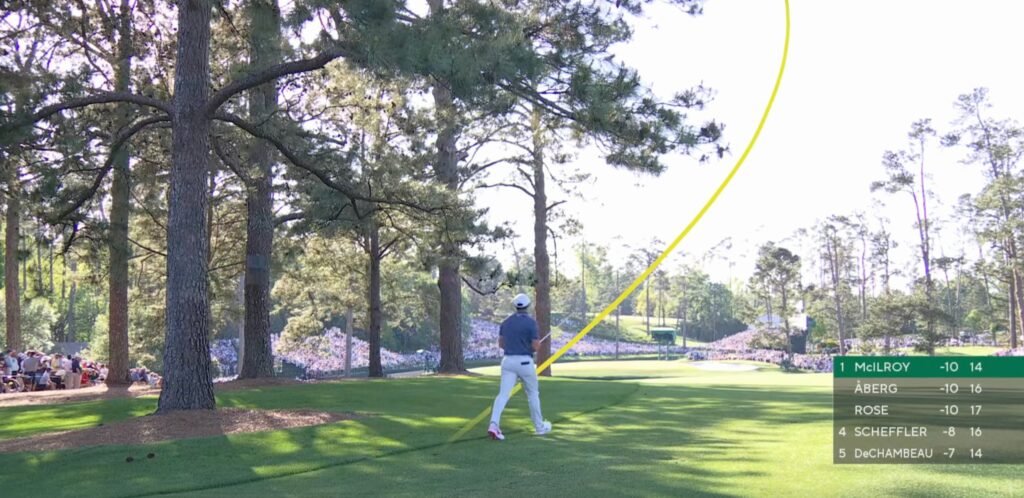 After a few stumbles in the middle of his round, Rory then delivered what was then the signature shot of the tournament with a towering iron shot into the par-5 15th hole setting up another eagle. He ended the day at 12-under par and with a two-shot lead.