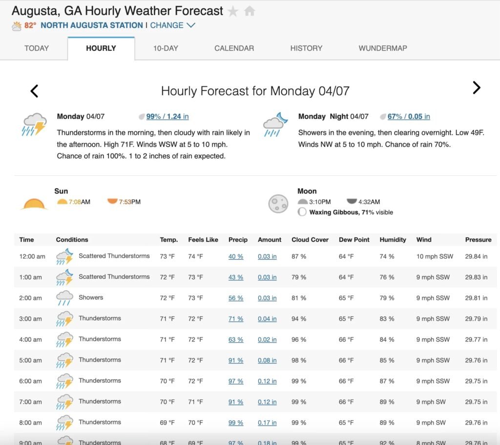 However, as the day drew closer the bad news slowly started to trickle in. First in mid-March it was announced that Tiger Woods had ruptured his Achilles tendon and would miss significant time including The Masters only weeks away. Next, as the forecast started to take shape it quickly started to paint a bleak picture of what was planned to be a day of a dream come true. Originally forecasted as light and scattered rain turned to all day rain, to potentially severe thunderstorms. The anxiety grew to a fever pitch, sometimes even waking up multiple times in the middle of the night to check every weather forecast I could find. I was desperate to find the weather model that would allow me to take in Augusta National in all its glory.